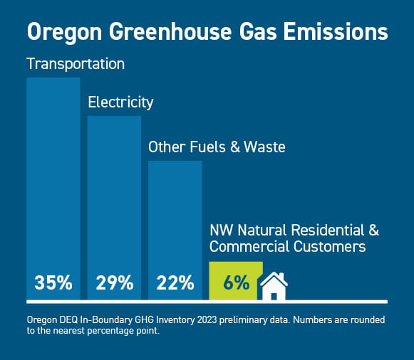 The energy we provide to residential and commercial customers in Oregonaccounts for about 6% of the state’s overall GHG emissions, compared to electricity at 29% – and the transportation sector, which is still the largest emitting sector.[2]Oregon DEQ In-Boundary GHG Inventory 2023 preliminary data. Available at: https://www.oregon.gov/deq/ghgp/Pages/GHG-Inventory.aspx