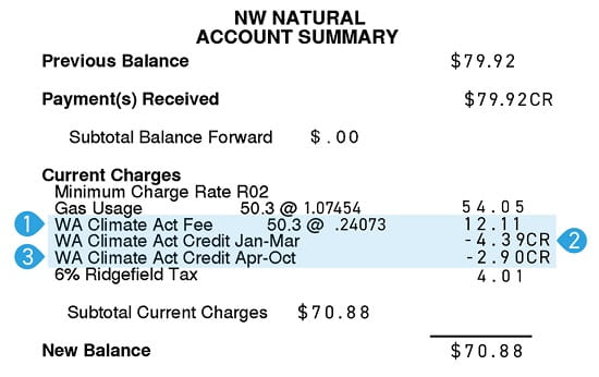 - The Climate Act Credit is revenue from greenhouse gas (GHG) emissions sold at auction. This credit is reserved for customers connected to NW Natural’s system prior to July 25, 2021, and Identified Low-Income Customers. Customers were credited a higher amount during the colder weather months of January through March 2025, to help offset higher winter usage and costs.